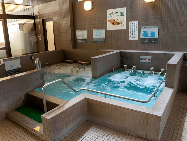 水深1メートルの温泉浴をはじめ、[熱気浴サウナ]、 塩を全身に塗って発汗を即す美肌効果抜群の[ソルティーサウナ]、 体の側面よりジェット噴流があたり、脇、太股、膝などにマッサージ効果のある[ローリングバス]、 どんな人でも浮き上がる?!全身浮き上がりマッサージ効果の[うきうきぶろ]、 [かたたたき]、[エステバス]、[ドリームバス]、[水風呂]、[露天風呂]があり、おこさまからご年配の方までお楽しみいただけます。